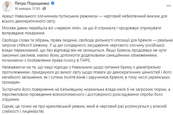 Например, Петр Порошенко, который назвал задержание "вызовом всему демократическому миру". Правда, уточнив, что "наши подходы с Навальным по вопросу Крыма являются диаметрально противоположными".