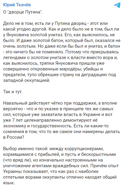 Дело не в том, есть ли у Путина дворец - этот или какой угодно другой. Как и дело было не в том, был ли у Януковича золотой унитаз. Его, как выяснилось, не было. И даже золотой батон, который был, оказался не очень золотым. Но даже если бы был и унитаз, и батон - это ничего бы не поменяло. Потому что, прикрываясь легендами о золотом унитазе, к власти вместо вора и, как выяснилось, тряпки Януковича пришли уже совершенно откровенные мародёры, убийцы и предатели, тупо обрекшие страну на деградацию под западной оккупацией.