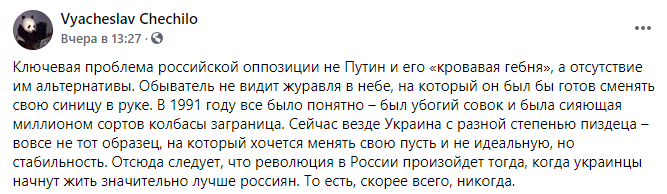 "Ключевая проблема российской оппозиции не Путин и его "кровавая гебня", а отсутствие им альтернативы. Обыватель не видит журавля в небе, на который он был бы готов сменять свою синицу в руке. В 1991 году все было понятно – был убогий совок и была сияющая миллионом сортов колбасы заграница. Сейчас везде Украина с разной степенью п...ца – вовсе не тот образец, на который хочется менять свою пусть и не идеальную, но стабильность. Отсюда следует, что революция в России произойдет тогда, когда украинцы начнут жить значительно лучше россиян. То есть, скорее всего, никогда".