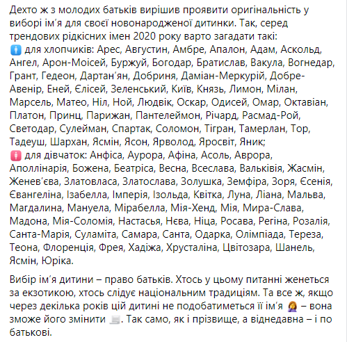 Мальчиков называли такими оригинальными именами, как: Арес, Августин, Амбре, Апалон, Адам, Аскольд, Ангел, Арон-Моисей, Буржуй, Богодар, Братислава, Вакула, Вогнедар, Грант, Гедеон, Дартаньян, Добрыня, Дамиан-Меркурий, Хорошо-Авенир, Эней, Елисей, Зеленский, Киев, князь, Лимон, Милан, Марсель, Матео, Нил, Ной, Людвик, Оскар, Одиссей, Омар, Октавиан, Платон, Принц, Парижан, Пантелеймон, Ричард, Расмад-Рой, Светодар, Сулейман, Спартак, Соломон, Тигран, Тамерлан, Тор, Тадеуш, Шархан, Ясмин, Ясон, Марволо, Яросвит, Яник.