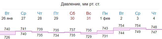 Что же касается атмосферного давления, то в Киеве 27 января оно будет в пределах нормы 740-742 мм. рт. А вот с 28 по 31 января включительно будет ниже нормы от 729 до 734 мм. рт.