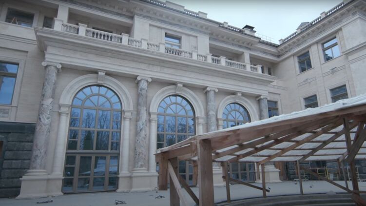 "Все находится на нулевом этапе строительства, перед друзьями не похвастаешься", - комментирует журналист. Снаружи хаотично валяются строительные материалы. При этом во дворце - множество рабочих, стоят строительные леса.