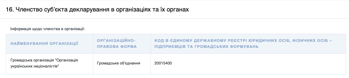 Из декларации чиновника становятся понятны и его политические взгляды. Он указал, что состоит в "Организации украинских националистов".