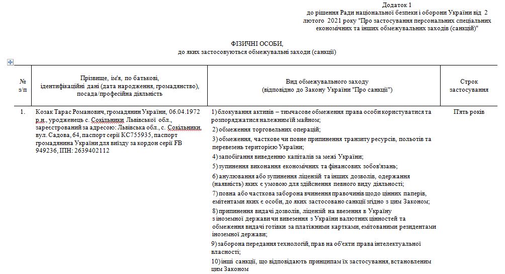 23:00 Вечером 2 февраля пресс-служба Офиса президента сообщила, что Владимир Зеленский подписал указ о введении санкций против народного депутата Украины из фракции "Оппозиционная платформа – За жизнь" Тараса Козака, а также восьми обществ с ограниченной ответственностью сроком на 5 лет, сообщила .