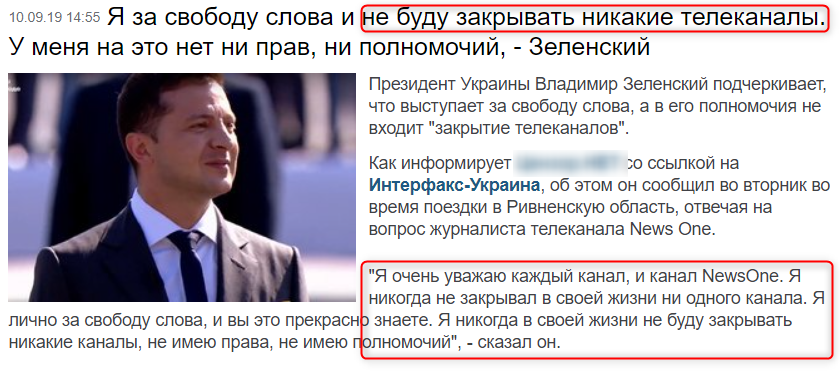 "Я очень уважаю каждый канал, и канал NewsOne. Я никогда не закрывал в своей жизни ни одного канала. Я лично за свободу слова, и вы это прекрасно знаете. Я никогда в своей жизни не буду закрывать никакие каналы, не имею права, не имею полномочий", - сказал Зеленский.