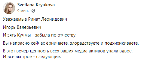 00:16 Замглавного редактора "Страны" Светлана Крюкова призывает остальных олигархов, у которых есть медиаактивы, приготовиться.