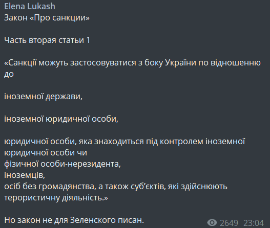 23:10 Юрист Елена Лукаш цитирует закон о санкциях. Там запрещено вводить их против граждан Украины.