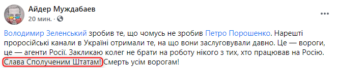 23:27 Крымскотатарский журналист Айдер Муждабаев порадовался закрытию каналов и выдвинул лозунг "Слава Соединенным Штатам".