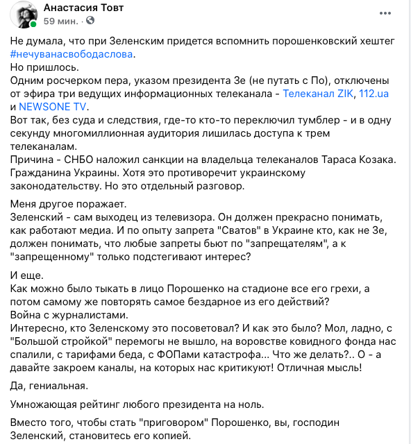 Анастасия Товт также отметила, что Зеленский повторяет ошибки своего предшественника Петра Порошенко, который тоже объявлял войну неугодным СМИ, за что поплатился своим рейтингом. И вспомнила о хештеге #нечуванасвободаслова.