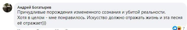 "Причудливые порождения измененного сознания и убитой реальности. Хотя в целом - мне понравилось. Искусство должно отражать жизнь и эта песня ее отражает".