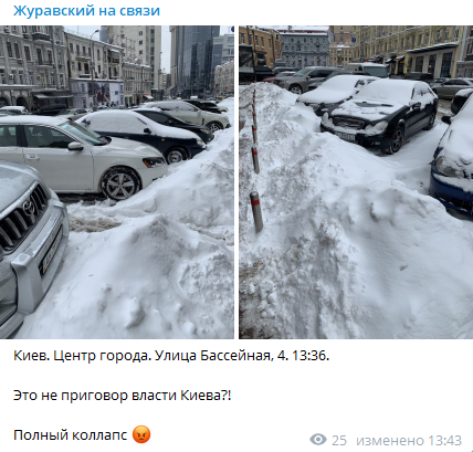 Известный юрист Виталий Журавский на своей странице в Telegram проиллюстрировал ситуацию в центре столице, где снег с дорог не убирают и не вывозят за пределы города. Его просто сваливают на обочины, блокируя припаркованные вдоль автомобили.