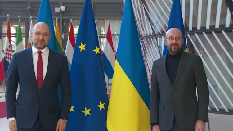 Оба политика на фото - в деловых костюмах. Правда, Мишель надел пиджак на черный гольф, а Шмыгаль надел белую рубашку и красный галстук.