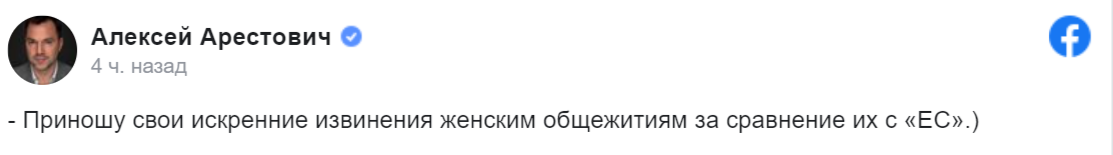 Во вторник, 16 февраля, Арестович извинился за свои слова, сказанные в программе. "Приношу свои искренние извинения женским общежитиям за сравнение их с "ЕС", - написал он в Фейбуке.
