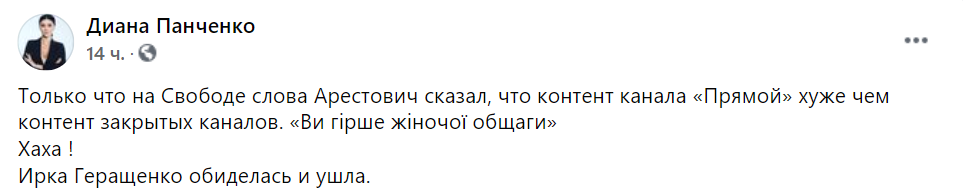 На это отреагировала телеведущая телеканала NewsOne Диана Панченко. "Только что на "Свободе слова" Арестович сказал, что контент канала "Прямой" хуже чем контент закрытых каналов....Ирка Геращенко обиделась и ушла", - написала она.