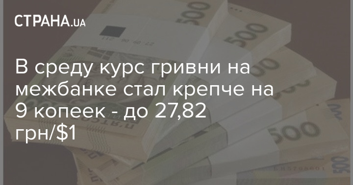 В среду курс гривни на межбанке стал крепче на 9 копеек - до 27,82 грн/$1