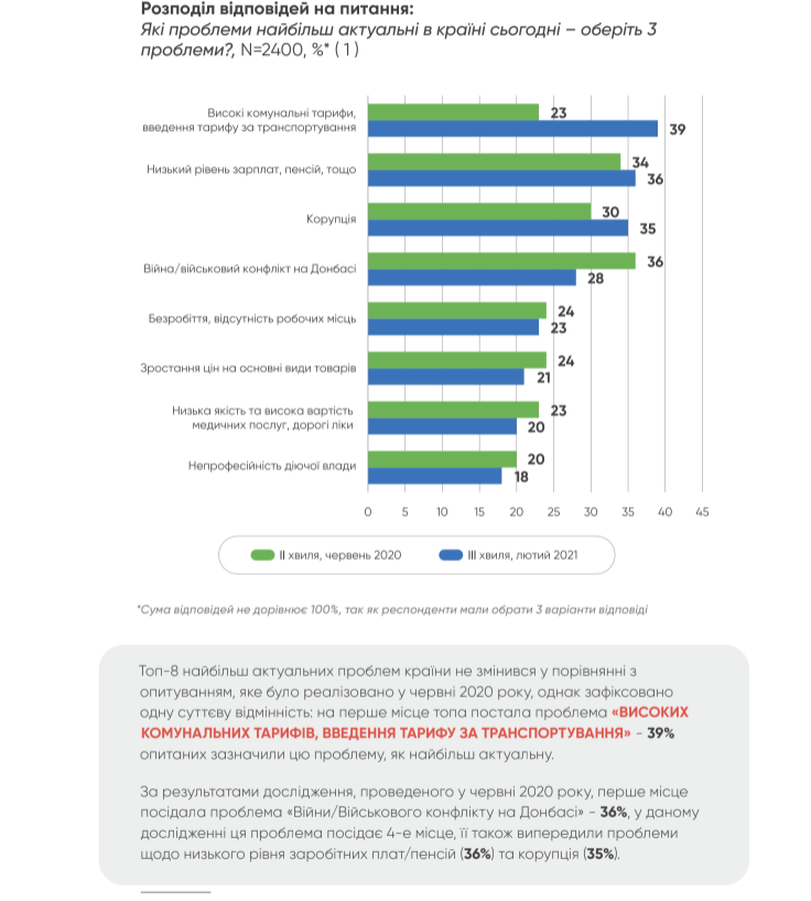 "Топ-8 самых актуальных проблем страны не изменились по сравнению с опросом, который был реализован в июне 2020 года, однако зафиксировано одно существенное отличие: на первое место топа встала проблема "высоких коммунальных тарифов, введение тарифов за транспортировку" - 39% опрошенных отметили эту проблему, как наиболее актуальную", - отметили социологи.