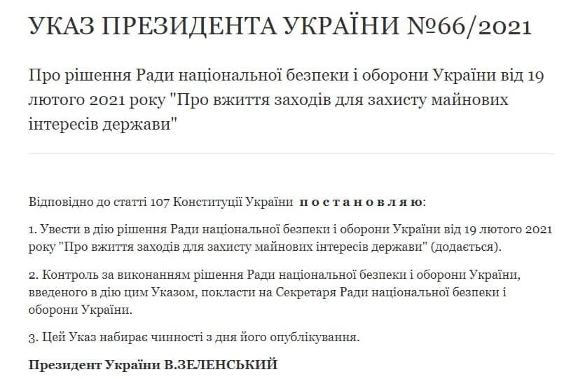 Президент Украины Владимир Зеленский подписал указ о решении Совета национальной безопасности и обороны Украины от 19 февраля 2021 "О принятии мер по защите имущественных интересов государства".