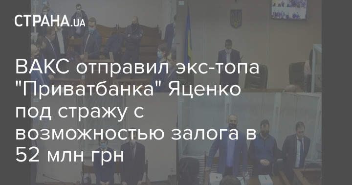 "Высший антикоррупционный суд отправил под стражу бывшего первого заместителя председателя правления "Приватбанка" Владимира Яценко до 22 апреля 2021 года. Судья также назначил альтернативой задержания залог в 52 210 000 грн", - заявили судьи.