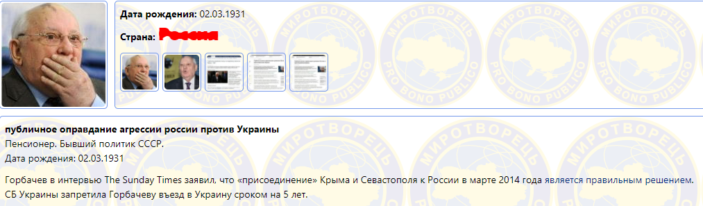 По словам Михаила Горбачева, он поступил бы точно так же на месте Путина. "Я всегда за свободное волеизъявление народа, а в Крыму большинство хотело воссоединения с Россией", - сказал он. После этих слов его занесли на "Миротворец". А СБУ запретила ему въезд на пять лет, которые, кстати, истекают в этом году.