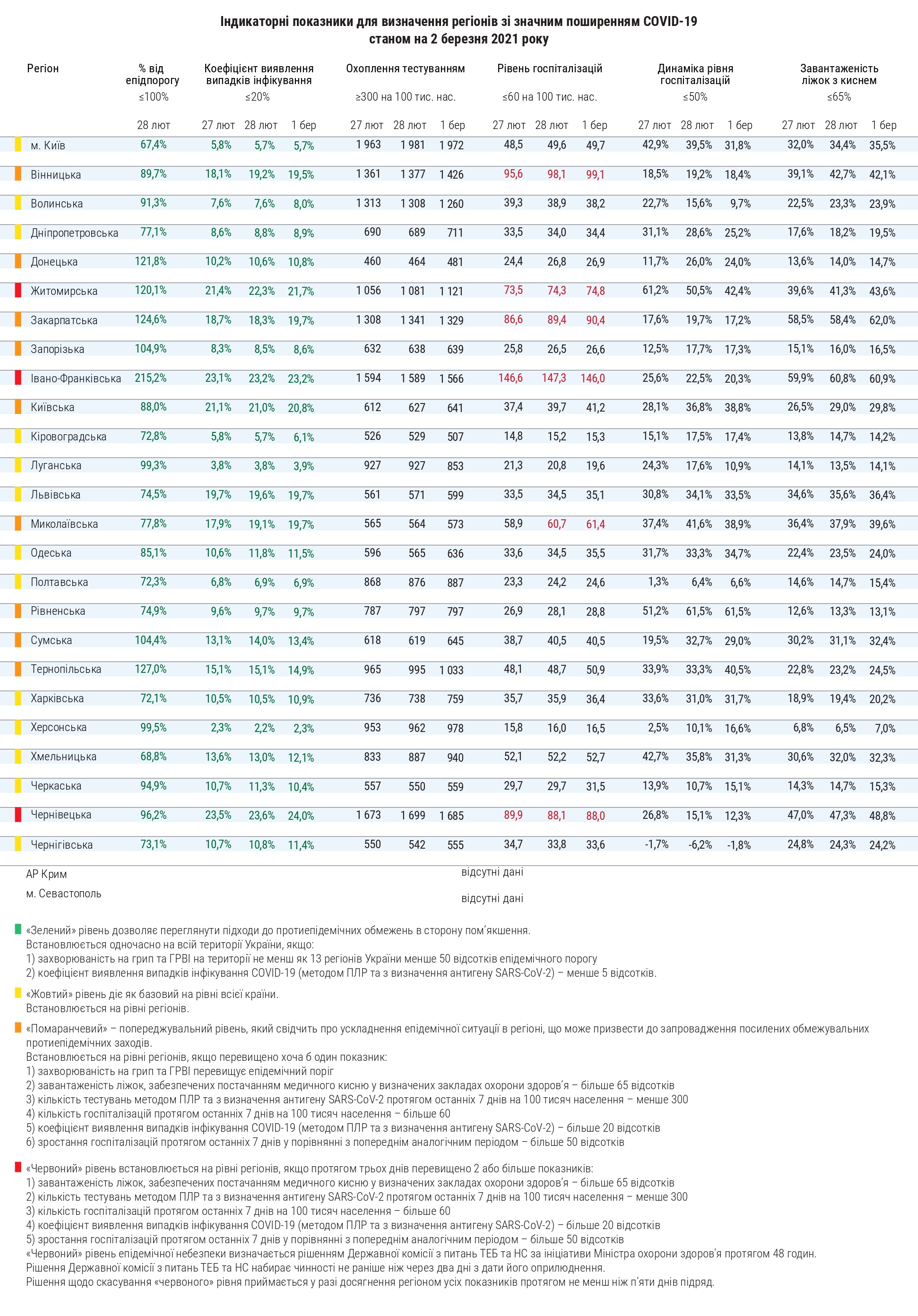 Минздрав отслеживает ситуацию с распространением коронавируса по шести критериям. Если есть превышение хотя бы по двум показателям на протяжении трех дней подряд - это является основанием для перехода в "красную" зону карантина.