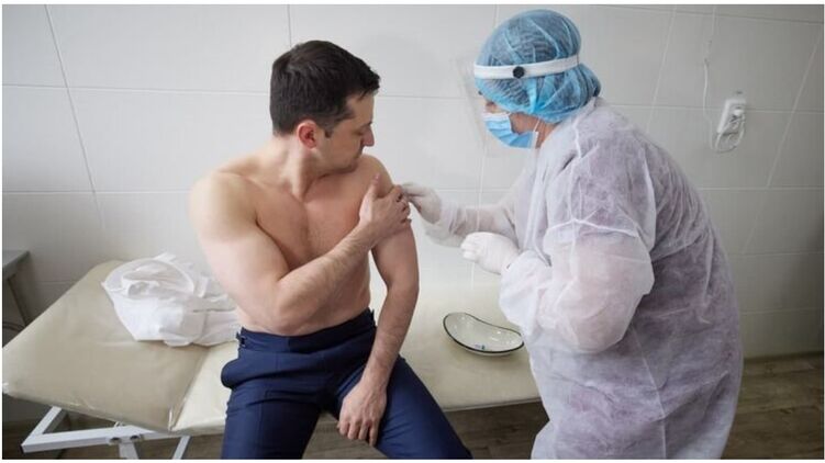 В сети появилась видеозапись вакцинации президента Владимира Зеленского. На видео глава государства заходит в медпункт, медработники спрашивают у президента фамилию, имя и отчество, а затем записывают полученные данные. Зеленского информирует, что он сейчас будет привит от коронавирусной болезни Covid-19 и предоставляют информацию о препарате. После монтажной склейки видео в кадре появляется полуобнаженный Зеленский - в этот момент ему делают укол в предплечье.
