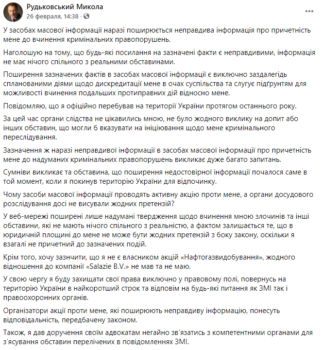 "Сообщаю, что я официально находился на территории Украины в течение последнего года. За это время органы следствия не интересовались мной, не было ни одного вызова на допрос или других обстоятельств, которые могли бы указывать на инициирование в отношении меня уголовного преследования...