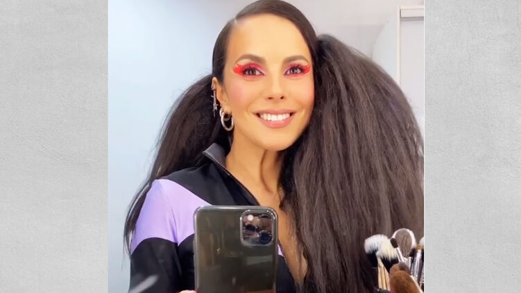 На видео она предстала с ярким макияжем, маникюром и феерической укладкой на голове.