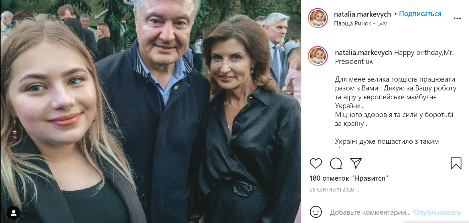 Она активно ведет свою страницу в Instagram, где не скрывает свои политические взгляды, называя себя "порохоботкой" и публикуя совместные фото с политиками - Софьей Федыной, Порошенко и его семьей, а также экс-спикером Рады Андреем Парубием.