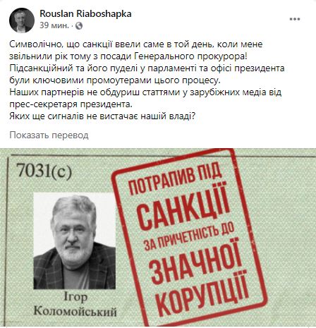 "Символично, что санкции ввели именно в тот день, когда меня уволили год назад с должности Генерального прокурора! Подсанкционный и его пудели в парламенте и офисе президента были ключевыми промоутерами этого процесса. Наших партнеров не обманешь статьями в зарубежных медиа от пресс-секретаря президента. Каких еще сигналов не хватает нашей власти?" - написал Рябошапка.