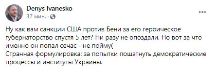 "Ну как вам санкции США против Бени за его героическое губернаторство спустя 5 лет? Ни разу не опоздали. Но вот за что именно он попал сейчас - не пойму. Странная формулировка: за попытки пошатнуть демократические процессы и институты Украины" - написал журналист Денис Иванеско.