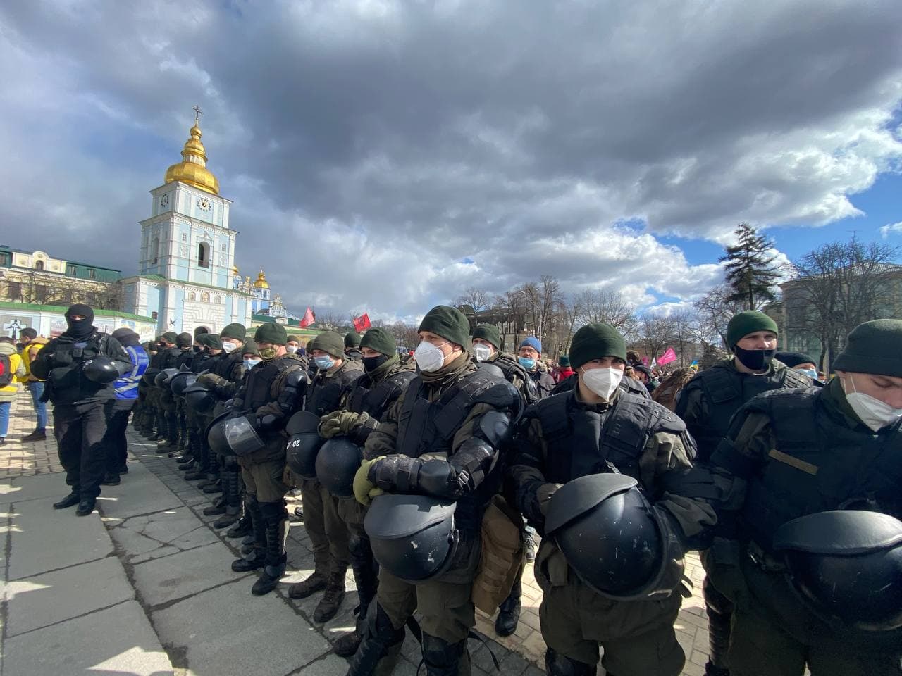 Участников женского марша правоохранители оцепили по кругу, чтобы избежать провокаций со стороны националистов.