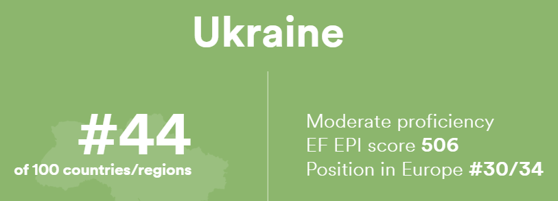 В мировом рейтинге знания английского языков Украина занимает 44-е место из 100 возможных (источник информации - индексе EF EPI 2020 года, - Ред). При этом если брать отдельно Европу, то здесь наши позиции гораздо хуже - 30-е место из 34-х стран.