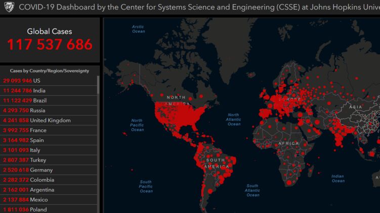 По данным на 10 марта, число зараженных на Земле приближается к 118 миллионам, фото: arcgis.com