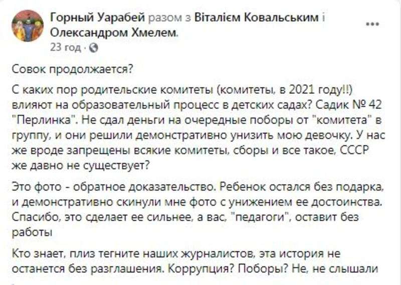 В посте Лесько возмутился тем, что "совок продолжается" и родительские комитеты продолжают влиять на образовательный процесс и периодически устраивать поборы.