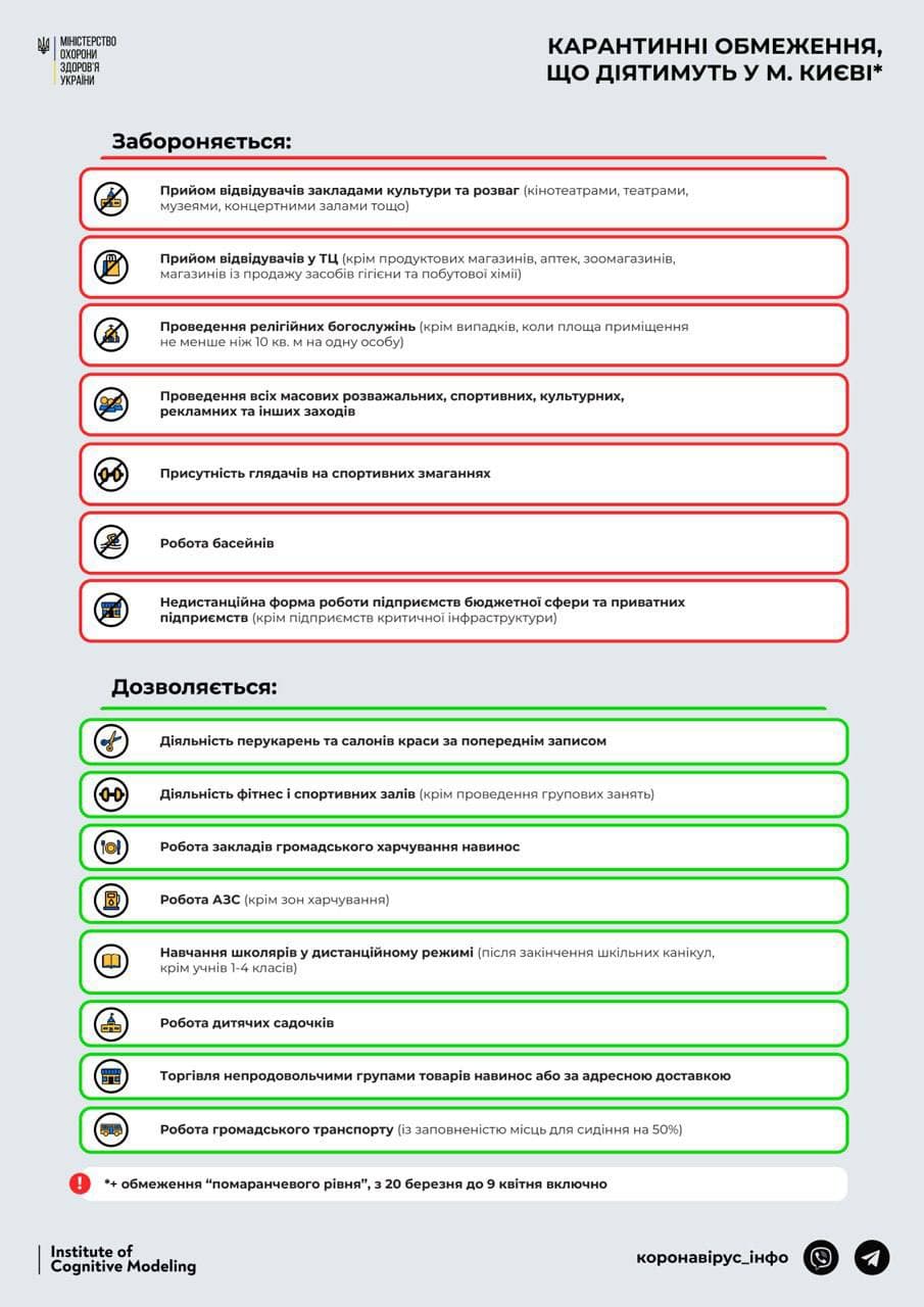 Ограничения, которые будут действовать в столице с 20 марта, подробно описаны в протоколе комиссии КГГА по чрезвычайным ситуациям.