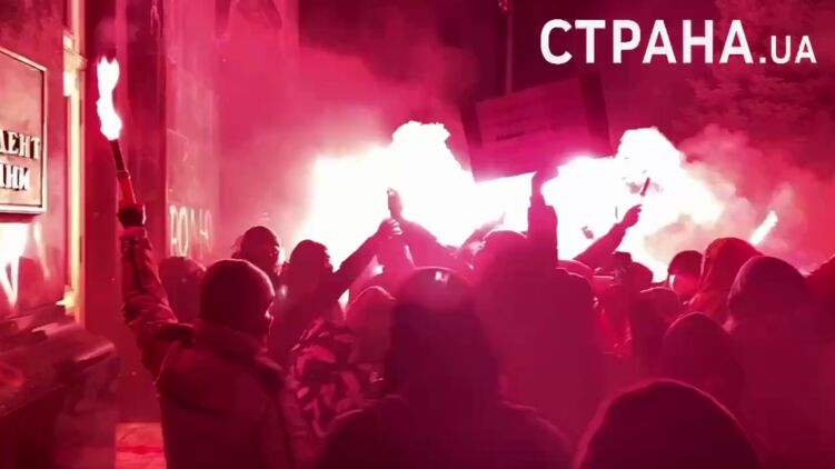 19:45 Жгут файеры и взрывают петарды, бросая их в здание офиса президента. При этом кричат "Аваков черт".