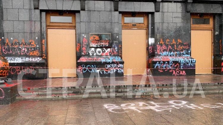 Здание Офиса президента, где в субботу вечером националисты устроили погром, все еще пестрит оставленными ими надписями. Кроме того, центральный вход остался без дверей - их сняли.