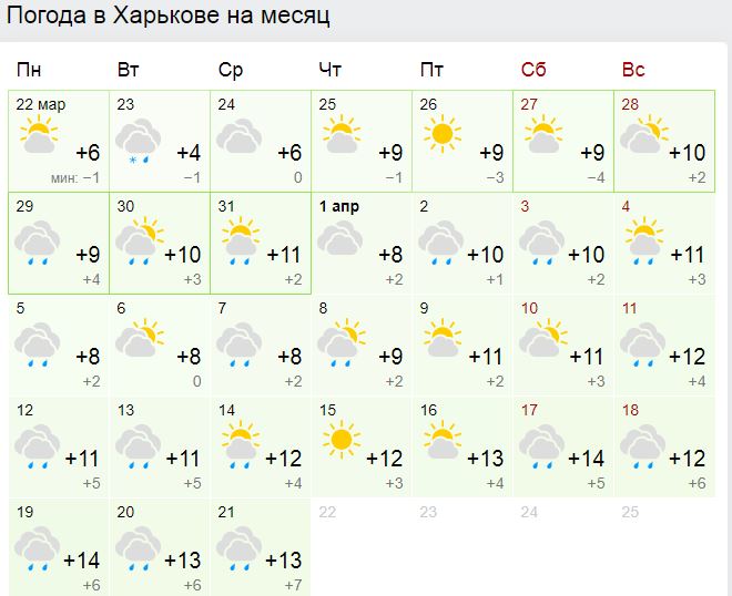 Примерно такую же погоду обещают в апреле в Харькове. Днем +9...+14 и череду дождей с 17 апреля.
