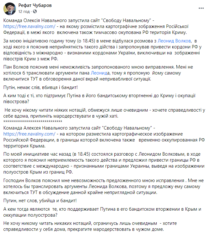 Глава Меджлиса крымскотатарского народа Рефат Чубаров заявил, что штаб российского оппозиционера Алексея Навального отказался исправлять карту на своем сайте, где Крым обозначен как часть Российской Федерации.