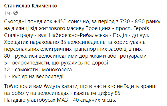 "Сегодня понедельник +4 °C, солнечно, за период с 7:30 - 8:30 утра на участке от жилого массива Троещина - ул. Героев Сталинграда - ул. Набережно-Рыбальская - Подол - до ул. Крещатик насчитывается 85 велосипедистов и пользователей персональных электрических транспортных средств, из них: