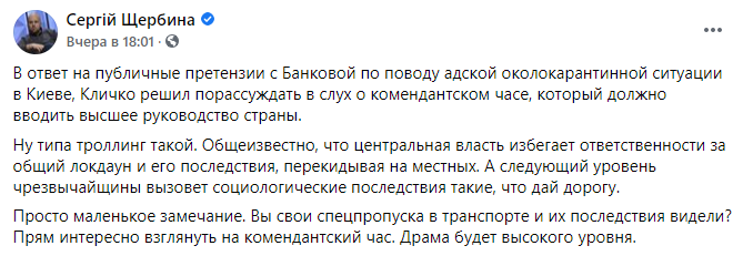 "В ответ на публичные претензии с Банковой по поводу адской околокарантинной ситуации в Киеве, Кличко решил порассуждать в слух о комендантском часе, который должно вводить высшее руководство страны.