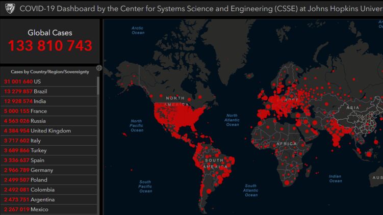 По данным на 9 апреля, число зараженных на Земле приближается к 134 миллионам, фото: университет Дж. Хопкинса