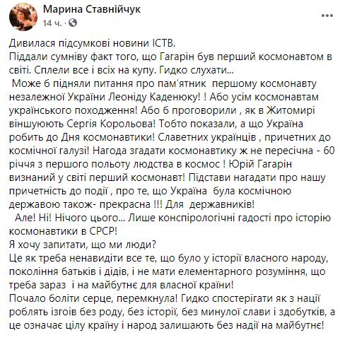 Может, подняли бы вопрос о памятнике первому космонавту независимой Украины Леониду Каденюку! Или всем космонавтам украинского происхождения! Или бы проговорили, как в Житомире чествуют Сергея Королева! То есть показали бы, что Украина Делает ко Дню космонавтики! Славных украинцев, причастных к космической Отрасли! Повод же упомянуть космонавтику не рядовой - 60 лет с первого полета человечества в космос! Юрий Гагарин признанный в мире первый космонавт! Напомнить о нашей причастности к событию, о том, что Украина была космической державой - также прекрасно!! Для государственников!