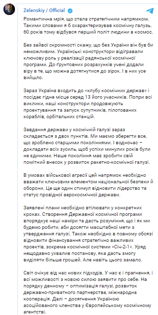 Президент Владимир Зеленский выпустил поздравление с Днем космонавтики на несколько абзацев.