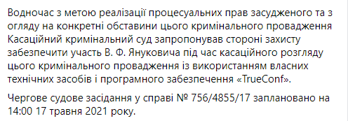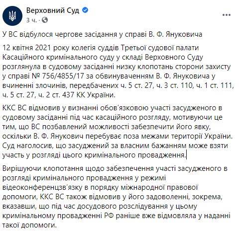 Кроме того, Верховный суд постановил, что рассмотрение кассации может проходить без Януковича, поскольку он находится за пределами территории Украины, добавив, что осужденный может по собственному желанию принять участие в рассмотрении этого уголовного производства.