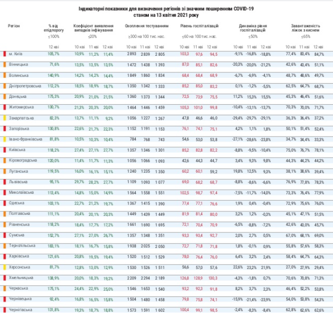 По состоянию на утро вторник, 13 апреля, в Украине сокращается уровень госпитализаций пациентов с Covid-19. Уже пять регионов соответствуют норме по этому показателю, в то время, как вчера было четыре. По сравнению с предыдущими сутками ситуация улучшилась в Луганской области.