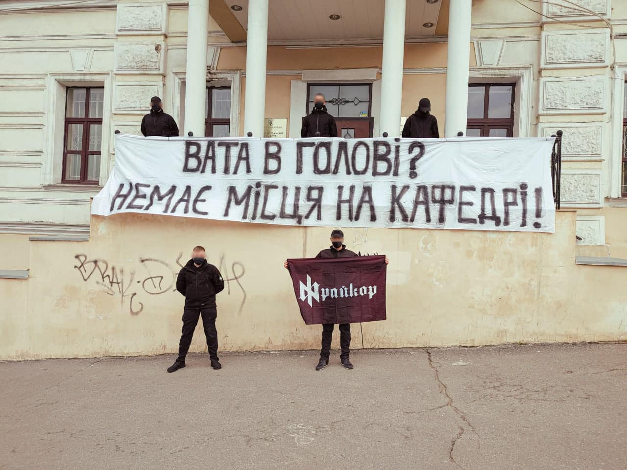Националисты развернули на крыльце вуза баннер с предупреждением: "Вата в голове? Нет места на кафедре".