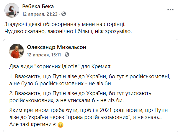 Все началось с перепоста волонтера благотворительного фонда "Харьков с тобой" Ребекки Беки. Она прокомментировала мнение журналиста Александра Михельсона о "полезных идиотах Кремля".