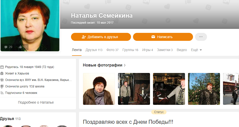 Однако преподаватель не заходила на свою страницу с 2017 года. Здесь всего три заметки, а в качестве статуса закреплены слова: "Поздравляю всех с Днем Победы".