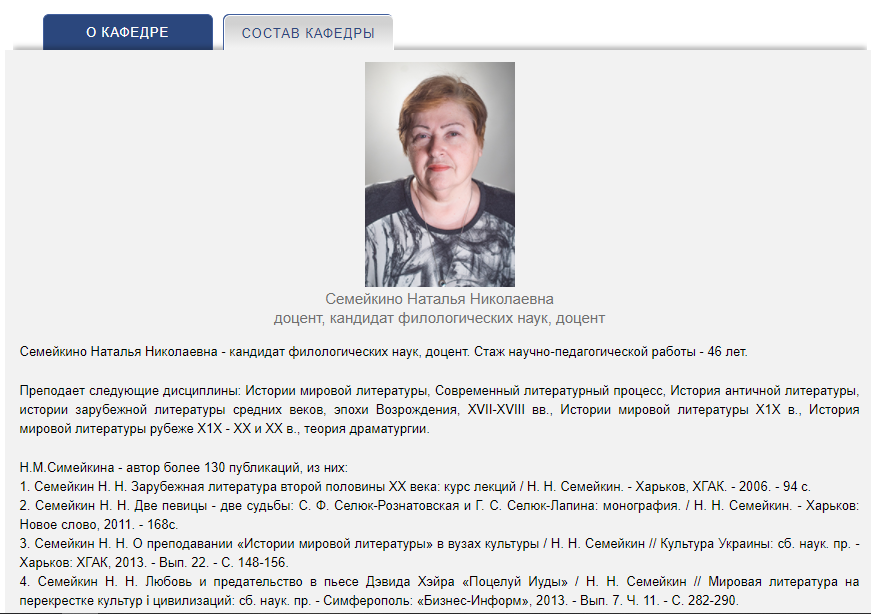 Наталье Семейкиной 72 года. Она преподает на факультете аудиовизуальных искусств, на кафедре гуманитаристики и искусствоведения, является кандидатом филологических наук, доцентом.